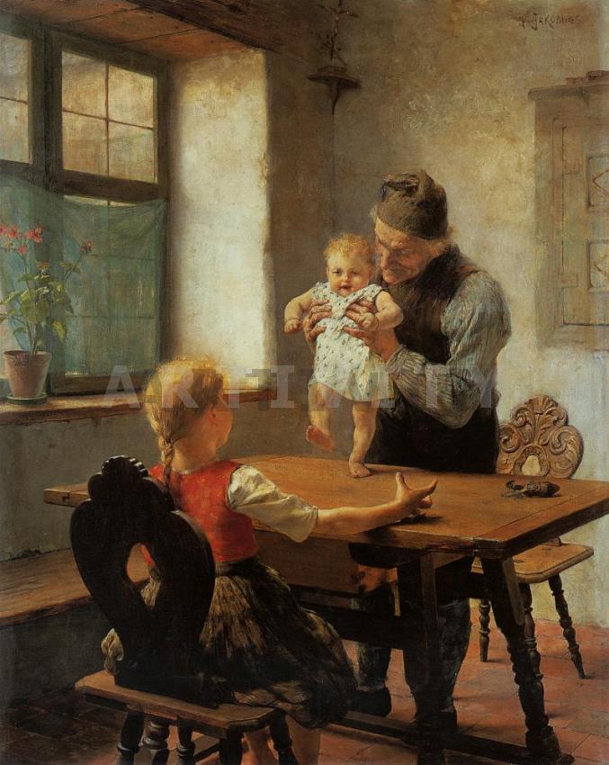 Πίνακας ζωγραφικής σε καμβά. Ο πίνακας "Τα Πρώτα Βήματα" από τον ζωγράφο Γεώργιος Ιακωβίδης (George Iakovidis) αναπαράγεται σε ποιοτικό βαμβακερό καμβά ζωγραφικής. Είναι ιδανικός για διακόσμηση σπιτιού, διακόσμηση γραφείου, ή όπου αλλού επιθυμείτε. Ακόμη και σαν πρόταση δώρου. Τα υλικά του, είναι κατάλληλα για εσωτερική χρήση. Τα χρώματα είναι ανθεκτικά, και με απαράμιλλη ζωντάνια. Το τελάρο καμβά, είναι από ξύλο πεύκου (υλικό που προτείνεται λόγω αντοχής) και όταν χρειάζεται (για μεγάλες διαστάσεις) φέρει επιπλέον ενίσχυση. Ο πίνακας μπορεί να δεχτεί και πρόσθετη επεξεργασία με λείο βερνίκι , ή με λαδοτυπία ("ελαιο-τυπία"). Τα οριζόντια έργα, μπορεί να αναπαραχθούν και σε τρίπτυχο, ή δίπτυχο πίνακα. (Το υδατογράφημα, δεν εμφανίζεται στην αναπαραγωγή του έργου).