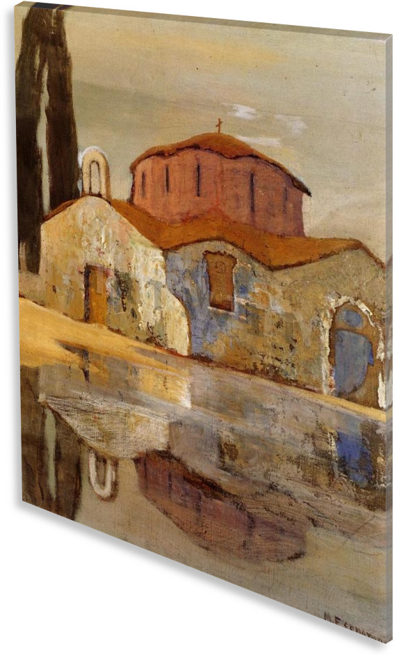 Πίνακας ζωγραφικής σε καμβά. Ο πίνακας "Βυζαντινή εκκλησία" από τον ζωγράφο Μιχάλης Οικονόμου (Michalis Oikonomou) αναπαράγεται σε ποιοτικό βαμβακερό καμβά ζωγραφικής. Είναι ιδανικός για διακόσμηση σπιτιού, διακόσμηση γραφείου, ή όπου αλλού επιθυμείτε. Ακόμη και σαν πρόταση δώρου. Τα υλικά του, είναι κατάλληλα για εσωτερική χρήση. Τα χρώματα είναι ανθεκτικά, και με απαράμιλλη ζωντάνια. Το τελάρο καμβά, είναι από ξύλο πεύκου (υλικό που προτείνεται λόγω αντοχής) και όταν χρειάζεται (για μεγάλες διαστάσεις) φέρει επιπλέον ενίσχυση. Ο πίνακας μπορεί να δεχτεί και πρόσθετη επεξεργασία με λείο βερνίκι , ή με λαδοτυπία ("ελαιο-τυπία"). Τα οριζόντια έργα, μπορεί να αναπαραχθούν και σε τρίπτυχο, ή δίπτυχο πίνακα. (Το υδατογράφημα, δεν εμφανίζεται στην αναπαραγωγή του έργου).