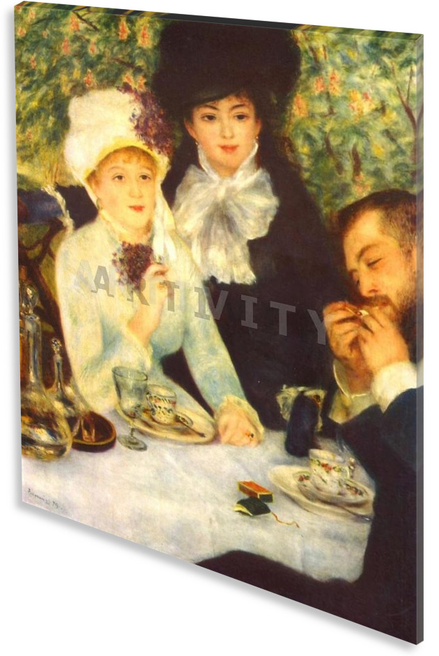 Πίνακας ζωγραφικής σε καμβά. Ο πίνακας "Το Τέλος Του Προγεύματος" από τον ζωγράφο Πιερ Ωγκύστ Ρενουάρ (Pierre Auguste Renoir) αναπαράγεται σε ποιοτικό βαμβακερό καμβά ζωγραφικής. Είναι ιδανικός για διακόσμηση σπιτιού, διακόσμηση γραφείου, ή όπου αλλού επιθυμείτε. Ακόμη και σαν πρόταση δώρου. Τα υλικά του, είναι κατάλληλα για εσωτερική χρήση. Τα χρώματα είναι ανθεκτικά, και με απαράμιλλη ζωντάνια. Το τελάρο καμβά, είναι από ξύλο πεύκου (υλικό που προτείνεται λόγω αντοχής) και όταν χρειάζεται (για μεγάλες διαστάσεις) φέρει επιπλέον ενίσχυση. Ο πίνακας μπορεί να δεχτεί και πρόσθετη επεξεργασία με λείο βερνίκι , ή με λαδοτυπία ("ελαιο-τυπία"). Τα οριζόντια έργα, μπορεί να αναπαραχθούν και σε τρίπτυχο, ή δίπτυχο πίνακα. (Το υδατογράφημα, δεν εμφανίζεται στην αναπαραγωγή του έργου).