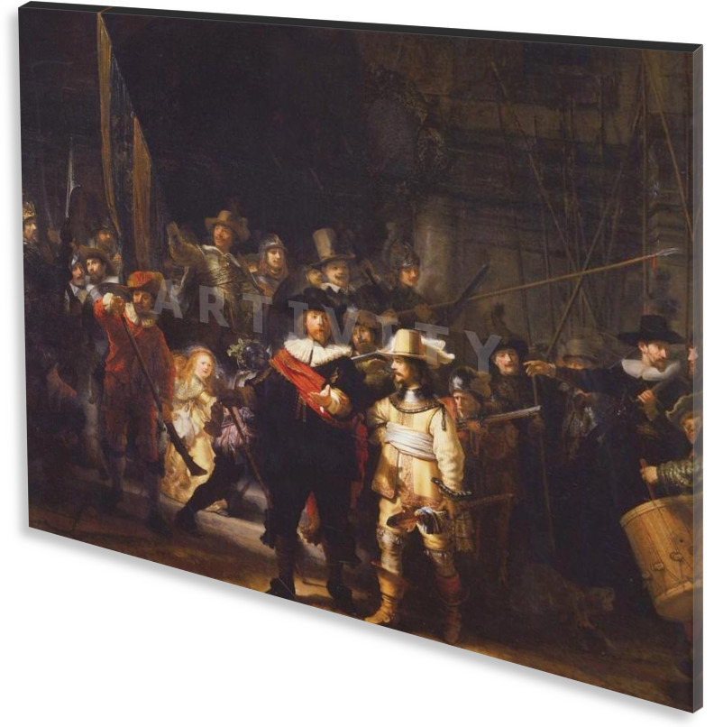 Πίνακας ζωγραφικής σε καμβά. Ο πίνακας "Η Νυχτερινή Περίπολος" από τον ζωγράφο Ρέμπραντ Χάρμενσοον βαν Ρέιν (Rembrandt Harmensohn van Rijn) αναπαράγεται σε ποιοτικό βαμβακερό καμβά ζωγραφικής. Είναι ιδανικός για διακόσμηση σπιτιού, διακόσμηση γραφείου, ή όπου αλλού επιθυμείτε. Ακόμη και σαν πρόταση δώρου. Τα υλικά του, είναι κατάλληλα για εσωτερική χρήση. Τα χρώματα είναι ανθεκτικά, και με απαράμιλλη ζωντάνια. Το τελάρο καμβά, είναι από ξύλο πεύκου (υλικό που προτείνεται λόγω αντοχής) και όταν χρειάζεται (για μεγάλες διαστάσεις) φέρει επιπλέον ενίσχυση. Ο πίνακας μπορεί να δεχτεί και πρόσθετη επεξεργασία με λείο βερνίκι , ή με λαδοτυπία ("ελαιο-τυπία"). Τα οριζόντια έργα, μπορεί να αναπαραχθούν και σε τρίπτυχο, ή δίπτυχο πίνακα. (Το υδατογράφημα, δεν εμφανίζεται στην αναπαραγωγή του έργου).